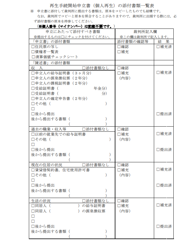 個人再生を申し立てる「申立書」の他、陳述書・債権者一覧表や財産目録、添付書類として、源泉徴収票・給与明細・通帳・住民票など(一例)が必要になります。